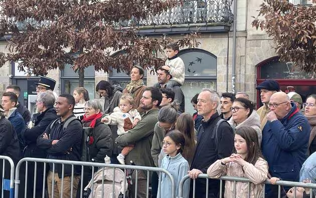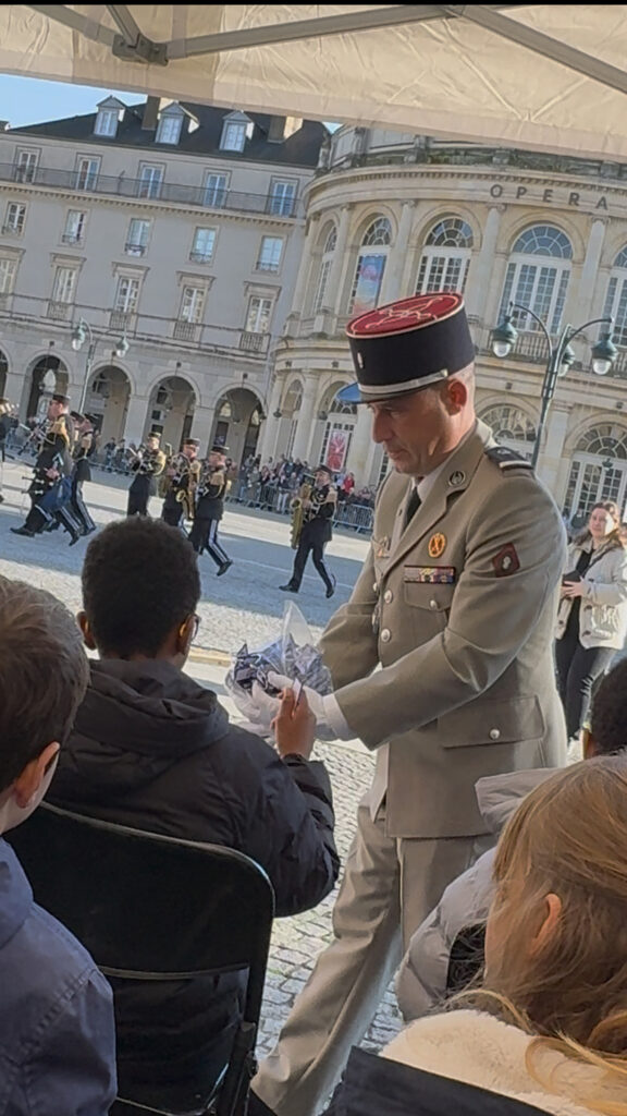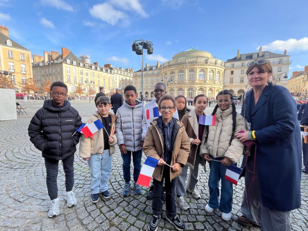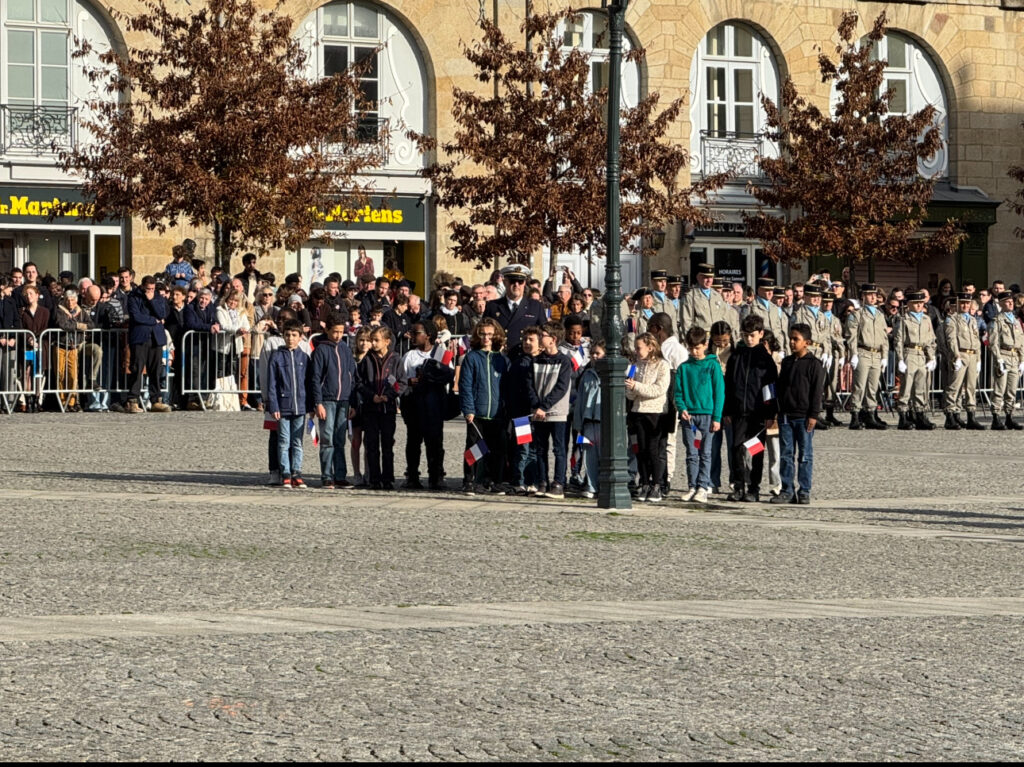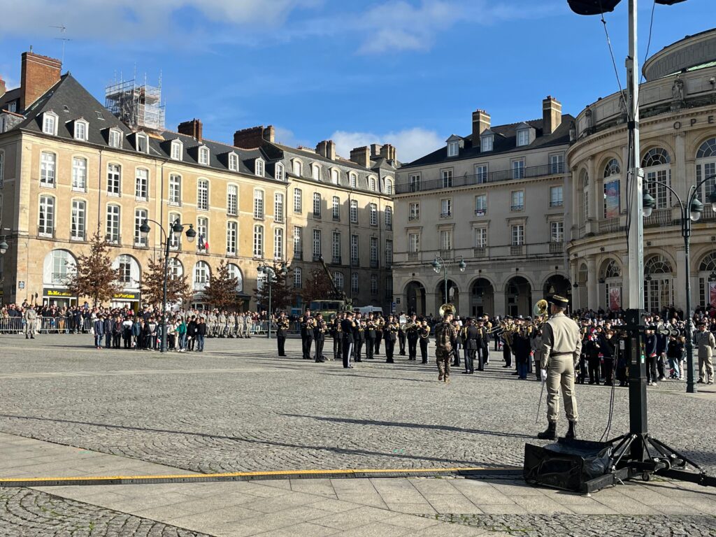 Beaucoup de personnalités, de militaires et de musique, ce dimanche 11-Novembre, sur la place de la Mairie à Rennes (Ille-et-Vilaine). Mais aussi des écoliers, associés à la commémoration de l’armistice du 11 novembre 1918.
